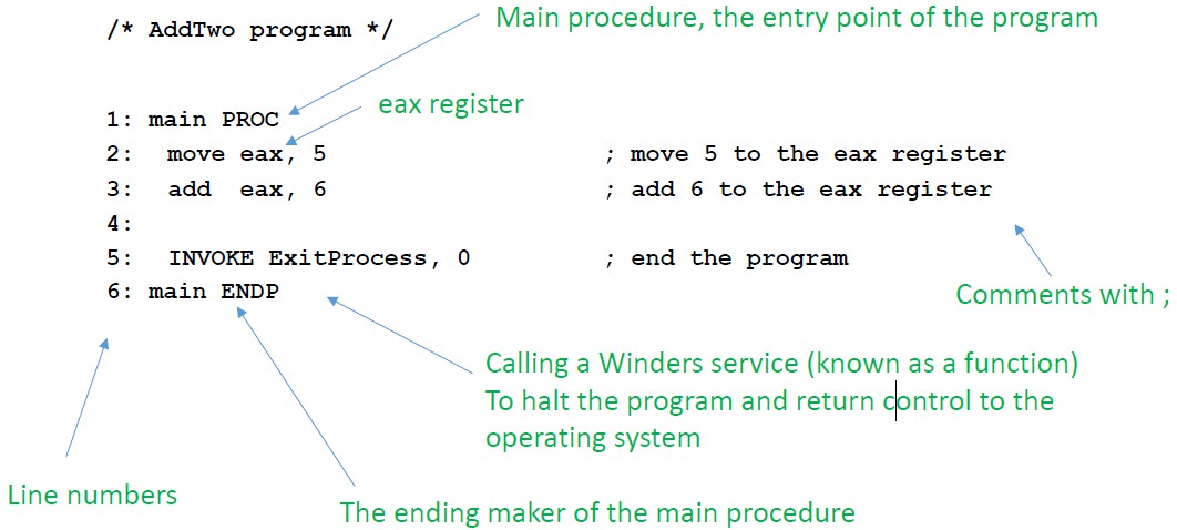 - .MODEL flat,stdcall (flat : generate code for protected mode) (stdcall : enables the calling of MS Windows)