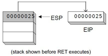 - 00000020 call MySub : 다음에 실행될 instruction(MOV)의 주소(00000025)를 stack에 push