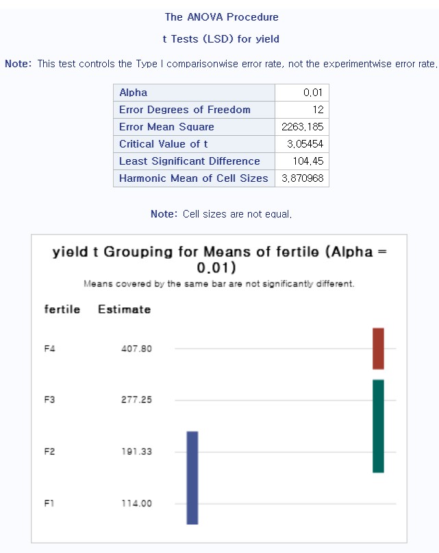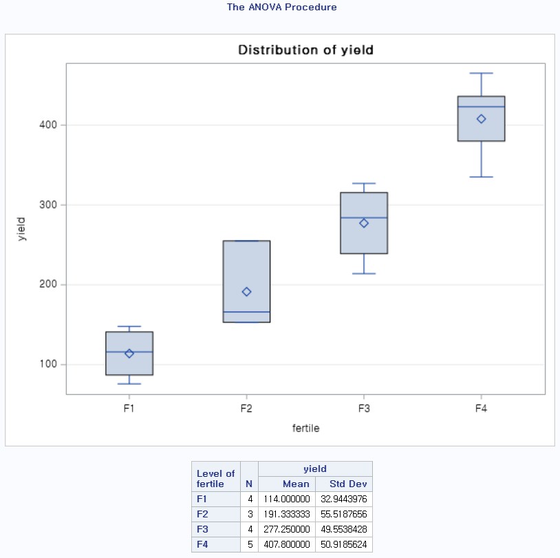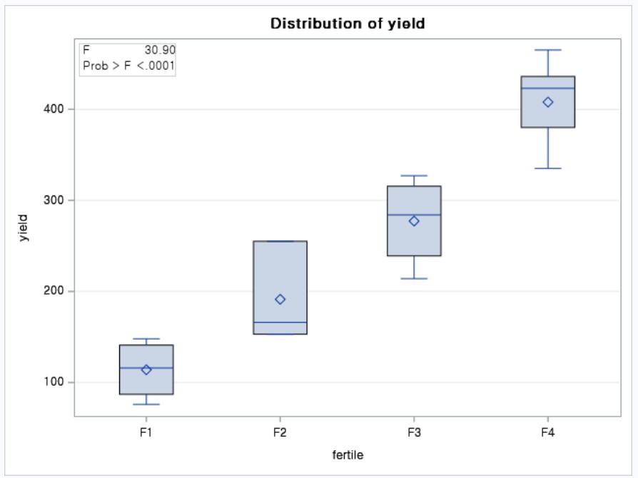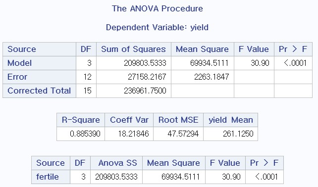 - model yield=fertile : yield를 반응 변수로 fertile을 독립변수로 지정