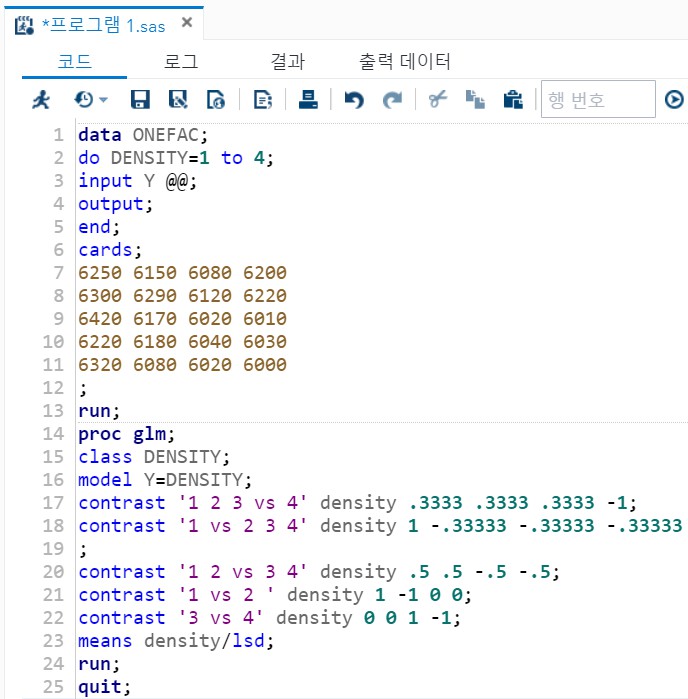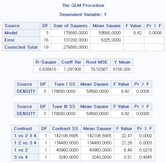 contrast '1 vs 2 3 4' density 1 -.33333 -.33333 -.33333