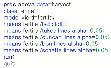 lsd도 검정이기 때문에 alpha를 지정해야 한다. (지정하지 않으면 0.05 수준에서 검정)