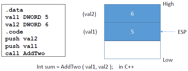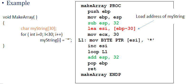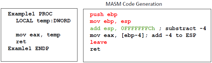 - LOCAL var1:BYTE, valword:WORD : 2개의 local variable (var1, valword)를 stack frame에 포함한다.