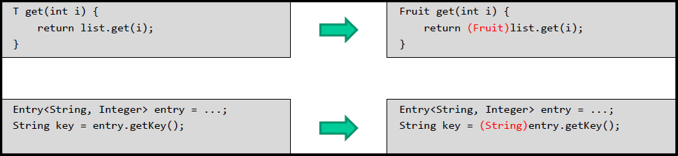 2> (generic type을 제거한 뒤에는) type cast(type 명시)가 필요한 곳에 type cast를 합니다.