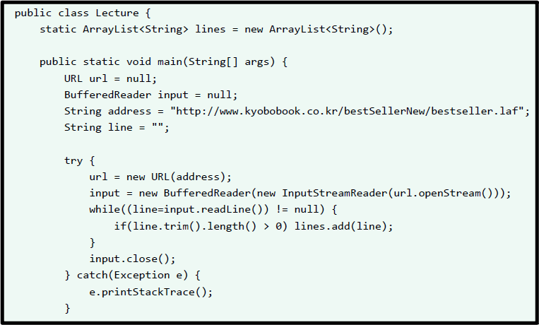 기존에 HTML 읽던대로 BufferedReader object를 만듭니다.