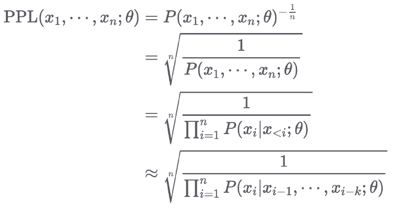 $$\begin{matrix} PPL(x_{1},\cdot\cdot\cdot,x_{n};\theta) &=P(x_{1},\cdot\cdot\cdot,x_{n};\theta)^{-\tfrac{1}{n}}\&=\sqrt[n]{1 \over P(x_{1},\cdot\cdot\cdot,x_{n};\ \theta)}\&=\sqrt[n]{1 \over \prod_{i=1}^n P(x_{i}|x_{<i};\theta)}\end{matrix} $$