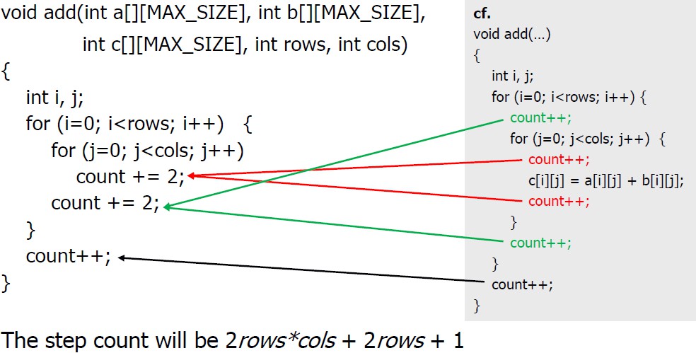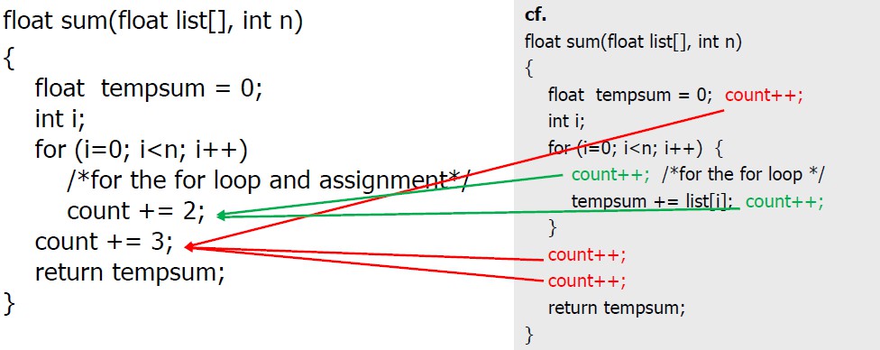 우리의 주요 관심사는 프로그램의 최종 횟수를 결정하는 것이기 때문에 프로그램 1.13에서 대부분의 프로그램 명령문을 제거해서 간단하게 프로그램 1.14와 같이 만들수 있는데, count에 대한 값은 동일하다. 이러한 단순화 과정은 총계(count)를 계산 하기 쉽게 한다. 프로그램 1.14를 보면, count의 초기 값이 0인 경우 최종 값이 2n + 3이 됨을 알 수 있다. 그래서 sum을 호출할 때마다 총 2n + 3 단계가 수행된다.